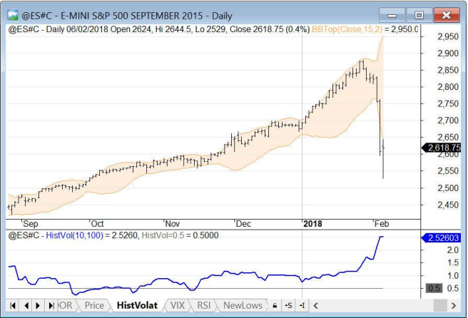 Con la fuerte caída la volatilidad se ha disparado, como es normal. Debajo vemos el SP500 con una banda de Bollinger de periodo 15 y 2 desviaciones estándar (valores por defecto) y se aprecia bien que ahora mismo el SP500 está por fuera así que se puede considerar en sobreventa y por consiguiente susceptible de girarse al alza.