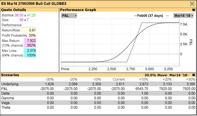 Evidentemente al coger las opciones de marzo esperamos que el rebote, de darse, sea antes del 16 de marzo. La curva del rendimiento actual es la continua. La curva a vencimiento es la discontinua. El punto muerto es el strike inferior más la prima, más o menos el nivel 2750. Si a vencimiento estamos por debajo de ese nivel tendremos la máxima pérdida de 2000 dólares. Supongo que no es una mala apuesta arriesgar 2000 dólares a que vendrá un rebote antes del 16 de marzo, pudiendo ganar mucho más de lo que se arriesga.