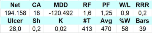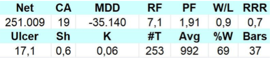 Desafortunadamente un stop tan alejado supone un riesgo demasiado elevado para la mayoría de cuentas. Pero vamos a seguir con la parte teórica y ver cómo serían las estadísticas después de aplicar los parámetros de la página anterior: