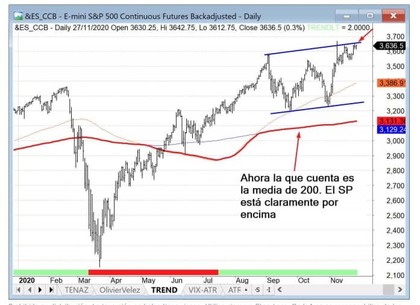 Debajo vemos el SP500 con el indicador TREND que confirma lo obvio: el mercado está alcista y por encima de la menor de las medias de 100 y 200 sesiones.