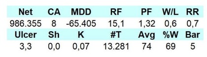 A mi tampoco me gusta hablar de cifras concretas pero casualmente la curva de capital superaba el millón así que no le di muchas vueltas para ponerle un nombre (tras muchos sistemas lo de bautizar se complica pues todos deberían llamarse diferente). Se parte de un capital de 100.000. El drawdown no se aprecia bien por la compresión del gráfico, pero el máximo valor es de 65K. Según el simulador el retorno anualizado es del 8.02%. Saludos