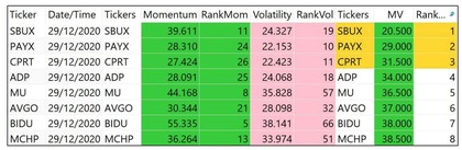 En verde tenemos las lecturas de momentum y su ranking respecto del conjunto de candidatos. Por ejemplo, la primera fila muestra el valor SBUX (StarBucks) con una rentabilidad del 39.61% en el periodo. Su ranking es el número 11; es decir, hay 10 valores con más rentabilidad que este.