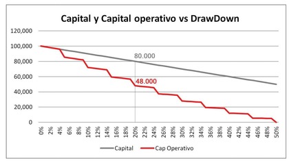 La línea gris representa un capital real que disminuye en drawdown constante. La línea roja es el capital operativo que se utiliza para dimensionar la cartera. En el momento mostrado el capital real (gris) tiene un drawdown del 20% así que si el valor inicial de capital era de 100.000 ahora es de 80.000.
