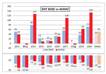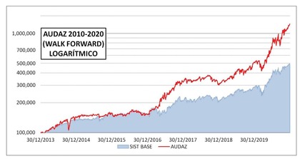 La operativa se reanuda posteriormente en los mismos valores en los que se detuvo ya que se trata de reducir el riesgo y no de modificar la estrategia de base. La siguiente gráfica compara la simulación en datos nuevos del sistema rotacional de base y el sistema base con el algoritmo de gestión de capital añadido (curva roja AUDAZ). Incluir el algoritmo a la solución base es rentable y duplica su beneficio.