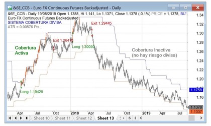 En la página siguiente vemos un gráfico del sistema de cobertura del riesgo divisa. En el primer periodo (finales de 2017) el eurodólar subió un 15% del mínimo al máximo, y el sistema cubrió un 9% de esta subida. En el segundo periodo (2018 y 2019) el eurodólar cae con fuerza y la cobertura está inactiva.