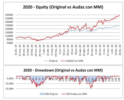 No obstante, no es un requisito disponer de un bróker que permita operar con apalancamiento. El sistema AUDAZ se puede operar en una cuenta de cash. Debajo vemos el año 2020 que es muy interesante por las caídas durante el mes de marzo. Hay una redistribución del drawdown que ahora es mayor en septiembre, cuando hay ganancias, por la variación del riesgo que hace el algoritmo.