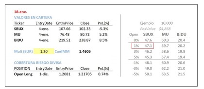 En la tabla podemos ver que estamos invertidos en tres valores: SBUX, MU y BIDU desde el 4 de enero de 2020. Se muestra el precio de entrada así como el último cierre. Ha cambiado el multiplicador o coeficiente de MM de la cartera así que tenemos que hacer un ajuste. Se calcula así para el primer valor: Num títulos SBUX = (40.000 * CoefMM / 3) / PrecioSBUX Puesto que operamos en apertura miraremos la cotización justo antes de que abra (15:25 hora española, por ejemplo) para hacer el cálculo. Supongamos es 103.35 (+1% en preapertura): Num títulos SBUX = (40.000 * 1.4605 / 3) / 103.35 = 188 títulos
