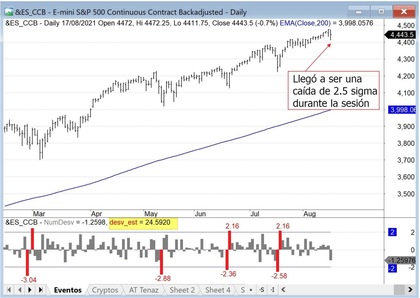 Debajo vemos el indicador de Jeff Augen que muestra una barra gris para ayer al cierre de solamente 1.26 desviaciones estándar; es decir, hubo un rebote intradiario de 1.27 desviaciones estándar. Esto es un comportamiento muy volátil, típico del mes de agosto donde el volumen de negociación se reduce mucho.