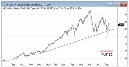 En informes anteriores hemos visto que la venta de opciones, si se hace con stop loss, tiene estas características. En el informe del miércoles pasado vimos que las opciones del Magro de Cerdo cumplían los requisitos de expectativa positiva. Desde entonces esta hipotética operación evoluciona muy bien aunque no lo inserto aquí para mostrar lo acertado que estuve escogiendo la entrada (no deja de ser una casualidad) sino para que vea que la PUT 70 está a kilómetros del precio y que lo normal será que se ingrese la prima de esta opción vendida en una tendencia muy alcista.