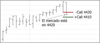 Así que la estrategia es bien simple, si el SP500 está cayendo mucho (p.e. un 2%) entonces compramos una CALL por debajo del precio actual y vendemos una Call por encima. Vamos a suponer que el SP500 está en 4420. Lo construiríamos tal y como se muestra debajo: