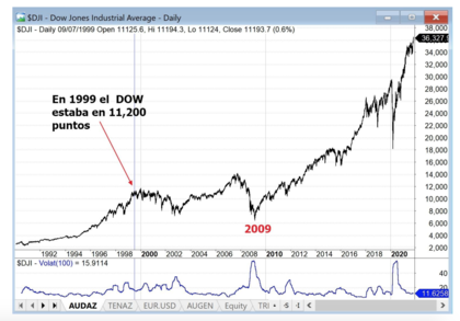 Glassman and Hassett (los autores) estaban tan seguros de que iban a acertar que respondieron a las críticas sobre su libro con la siguiente apuesta: “Si en diez años el DOW está más cerca de 10,000 que de 36,000 entonces cada uno de nosotros donará 1,000 dólares a la ONG que escojas”.