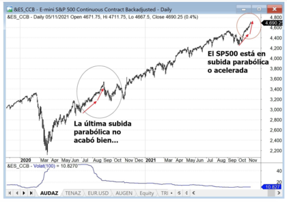 Veamos ahora el SP500 (debajo). Resulta que está en una subida parabólica y la última vez que hizo eso la cosa termino mal. En el gráfico puede ver que en septiembre del año pasado se aceleró al alza para colapsar después.