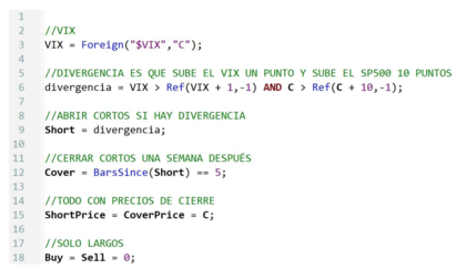 He construido el siguiente código que vemos debajo. En la línea 3 cargamos el VIX como un mercado aparte (se supone que el cierre principal será el del SP500). La variable divergencia recogerá todas las ocasiones en las que el VIX suba un punto y en el mismo día el SP500 suba 10 puntos. Todo respecto del día antes.