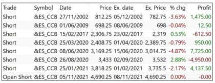 De estas 8 ocasiones 5 son aciertos; hay dos pérdidas y la operación de ayer se considera pérdida (ganancia para Amibroker es cualquier importe mayor que cero). Las estadísticas no están completas al incluir la operación de ayer. Si el SP500 va a estar más abajo el viernes próximo entonces la fiabilidad será 6/8 o del 75%.En cualquier caso no son datos suficientes para la fiabilidad estadística. Vamos a considerarlo una prueba, sin muchas pretensiones.