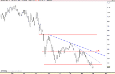 Hoy lo ha intentado pero una vez roto el lateral (8.06/4.81), mientras no veamos un cierre semanal por encima de esos 4.81, el riesgo de entrada para largo en el banco conlleva bastante riesgo, aunque tambien es cierto que la cercania al stop en 4.35 (algo debajo del mínimo de 2009) establece una relación riesgo/beneficio interesante. En los objetivos alcistas estaria la directriz acelerada de corto plazo que pasaria en estos momentos por los 5.52 y siendo optimistas y en caso de rebote fuerte de los mercados podriamos poner objetivos mayores ya situado en palabras mayores como son los 6.25.