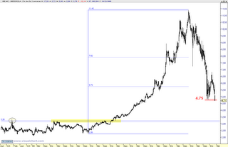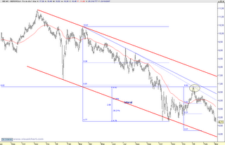 Aqui tenemos un valor muy seguido por el análisis tecnico y visto como está el mercado, con solo mirarlo en semanal, ya teniamos un datos importante como es la pérdida del nivel fibo del 61.80% de toda la estructura alcista desde los mínimos de 2002 hasta los máximos de 2007, por lo que una de las cosas probables es el camino del valor hasta el origen del movimiento que aunque parezca duro para los que esten dentro a contado y no hubieran colocado stop de pérdidas se situa en los 2.25 €, pero por poner algo de esperanza en la trayectoria del valor se encontrará antes con esa zona que ya fue de fuerte resistencia (ahora soporte) de los 3.20 € que podria en primera instancia parar el valor en su bajada y producir una zona de rebote, eso si, si el mercado para ese momento presenta buenas perspectivas alcistas.