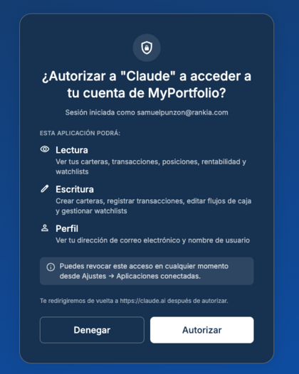 Desde Rankia hemos publicado un servidor MCP oficial de MyPortfolio. Cuando lo conectas, Claude deja de ser un chat genérico y pasa a poder: