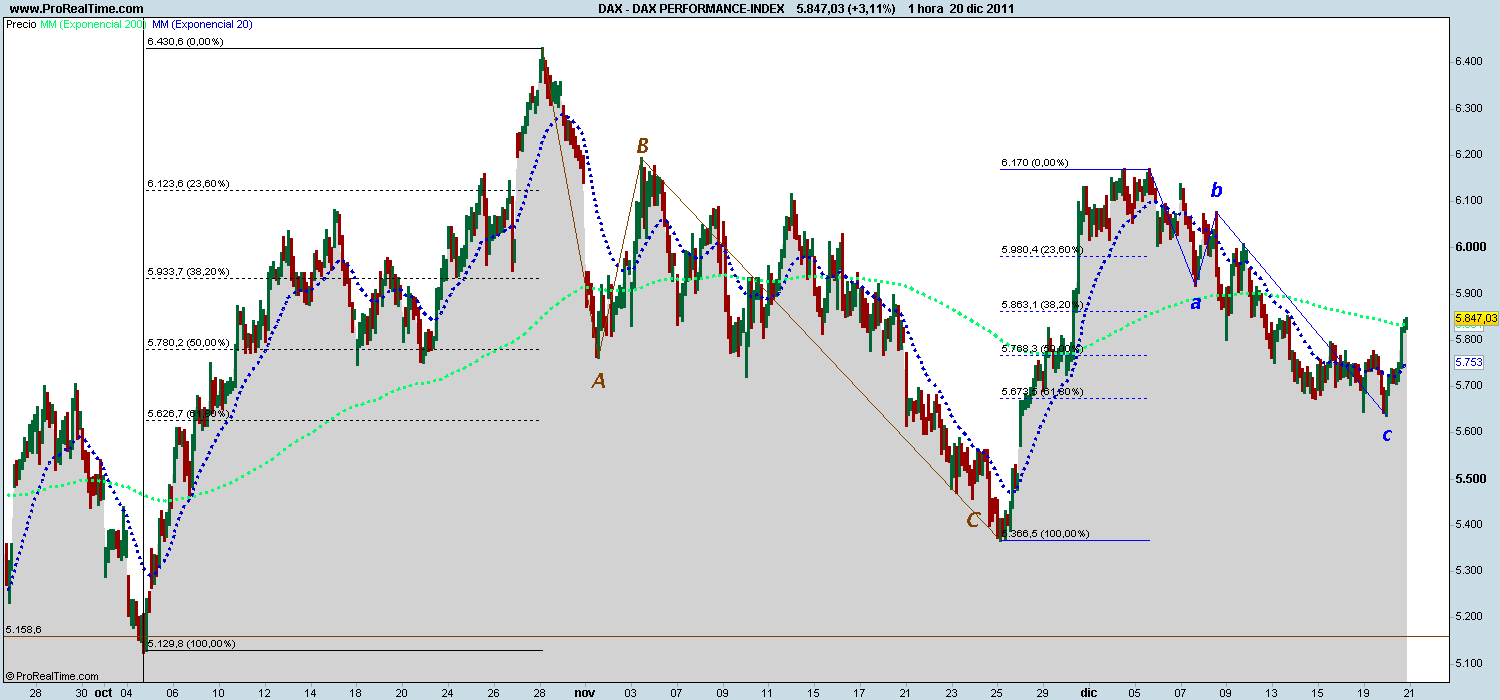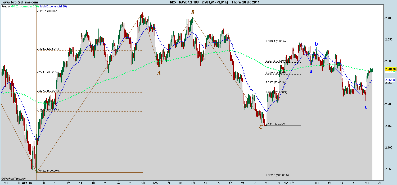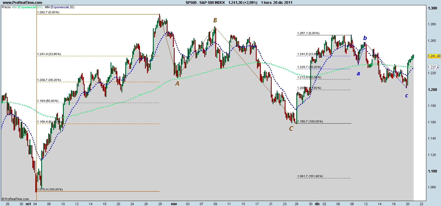 En los gráficos adjuntos se aprecia la subida producida en octubre, la posterior corrección en tres ondas ( A,B y C ) y el inicio del rebote al que hacíamos referencia en los tres últimos análisis ( La realidad de los mercados está en los gráficos , 2ª Parte , 3ª Parte ). A finales del mes de noviembre se produjo el ansiado rebote y como se puede ver, dicha subida está perfectamente corregida en tres ondas ( a, b y c ). En el proceso de formación de las ondas a y c ( bajadas ) se produjo un hecho muy significativo con respecto al índice VIX de volatilidad, a pesar de las fuertes caídas, estas no se vieron reflejas en un aumento significativo de la volatilidad. Este detalle ya se produjo el mes anterior y comentamos que lo interpretábamos como una divergencia alcista. Dicha divergencia tuvo su respuesta en la subida a la que hacíamos referencia.