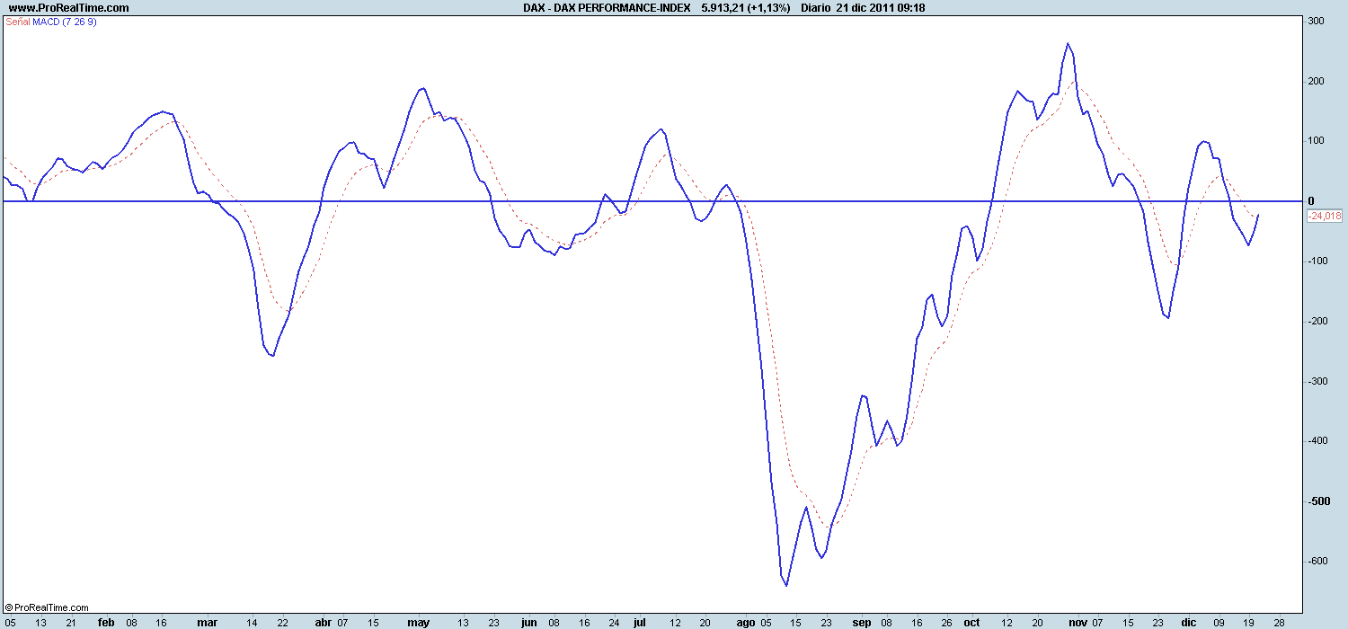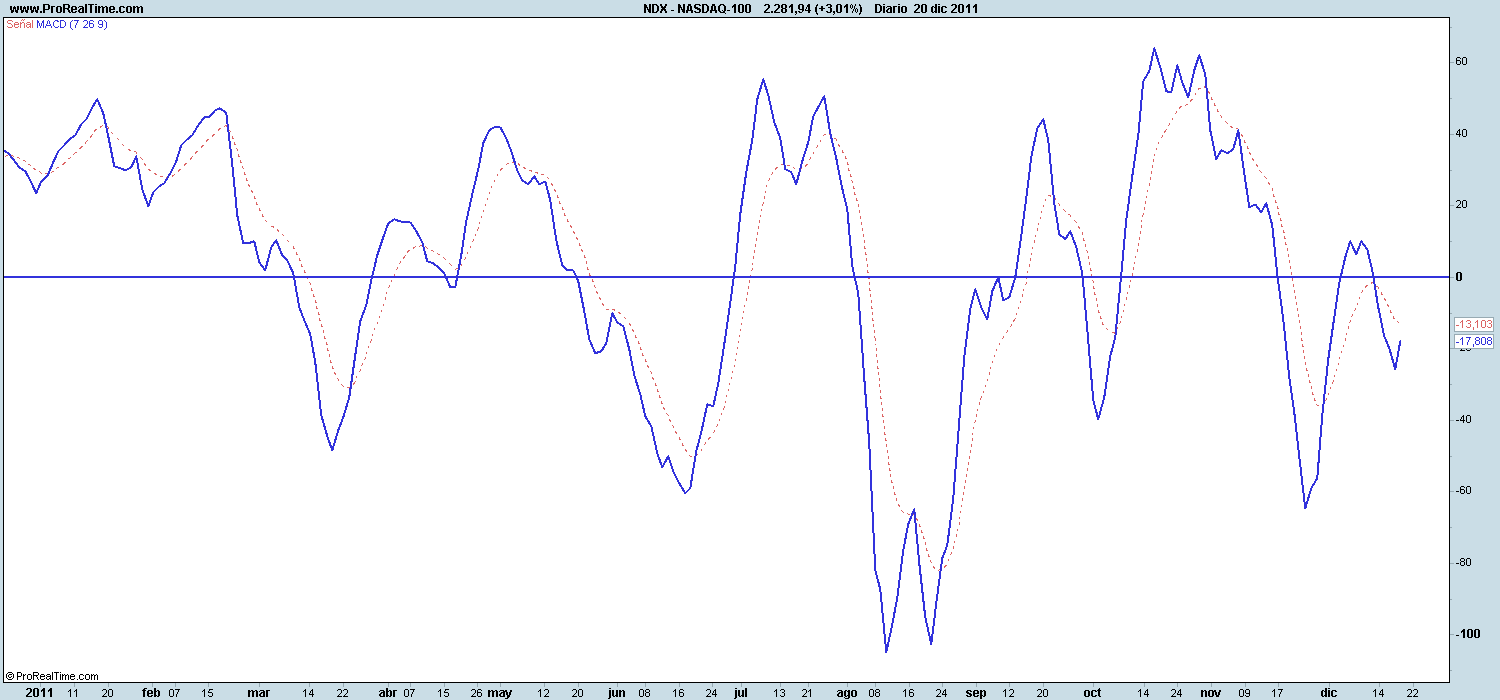 El MACD de 60 minutos en los tres índices, se encuentra cortado al alza y por encima de cero, lo que se traduce en señal de compra en muchos sistemas de especulación. Yo esperaría a que confirmara la señal el MACD diario, es decir, a que esté cortado al alza y por encima de cero, antes de abrir posiciones largas. La confirmación se producirá esta semana.