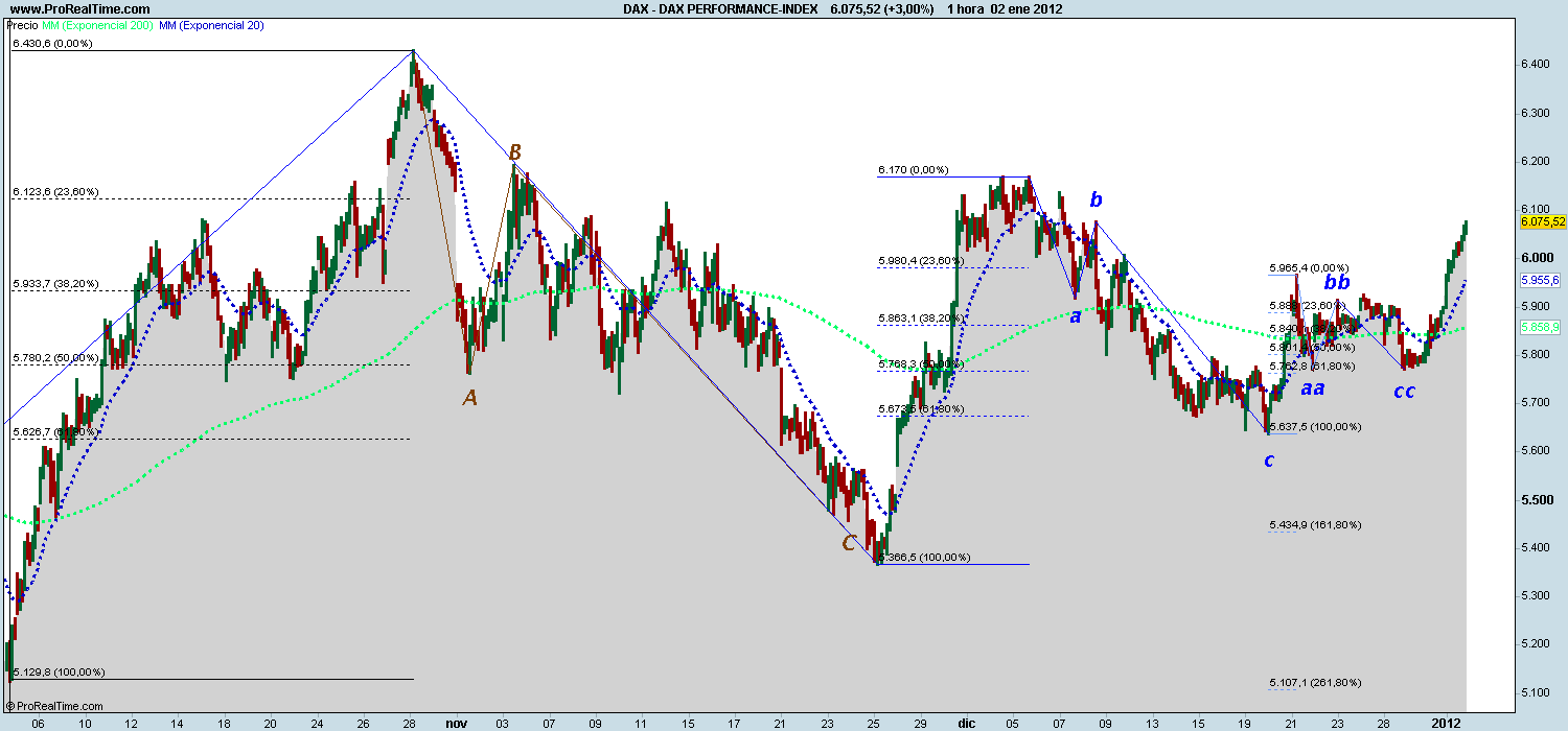 El gráfico representa la situación del DAX desde la subida iniciada en el mes de octubre. Como se puede apreciar ha corregido lo que tenía que corregir y se dirige hacia el primer objetivo, la cota de los 6.170 puntos.