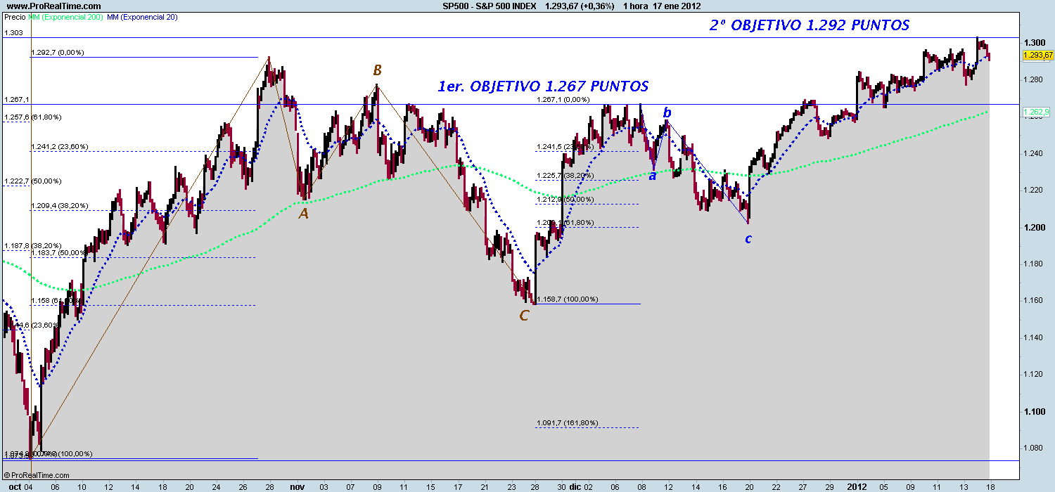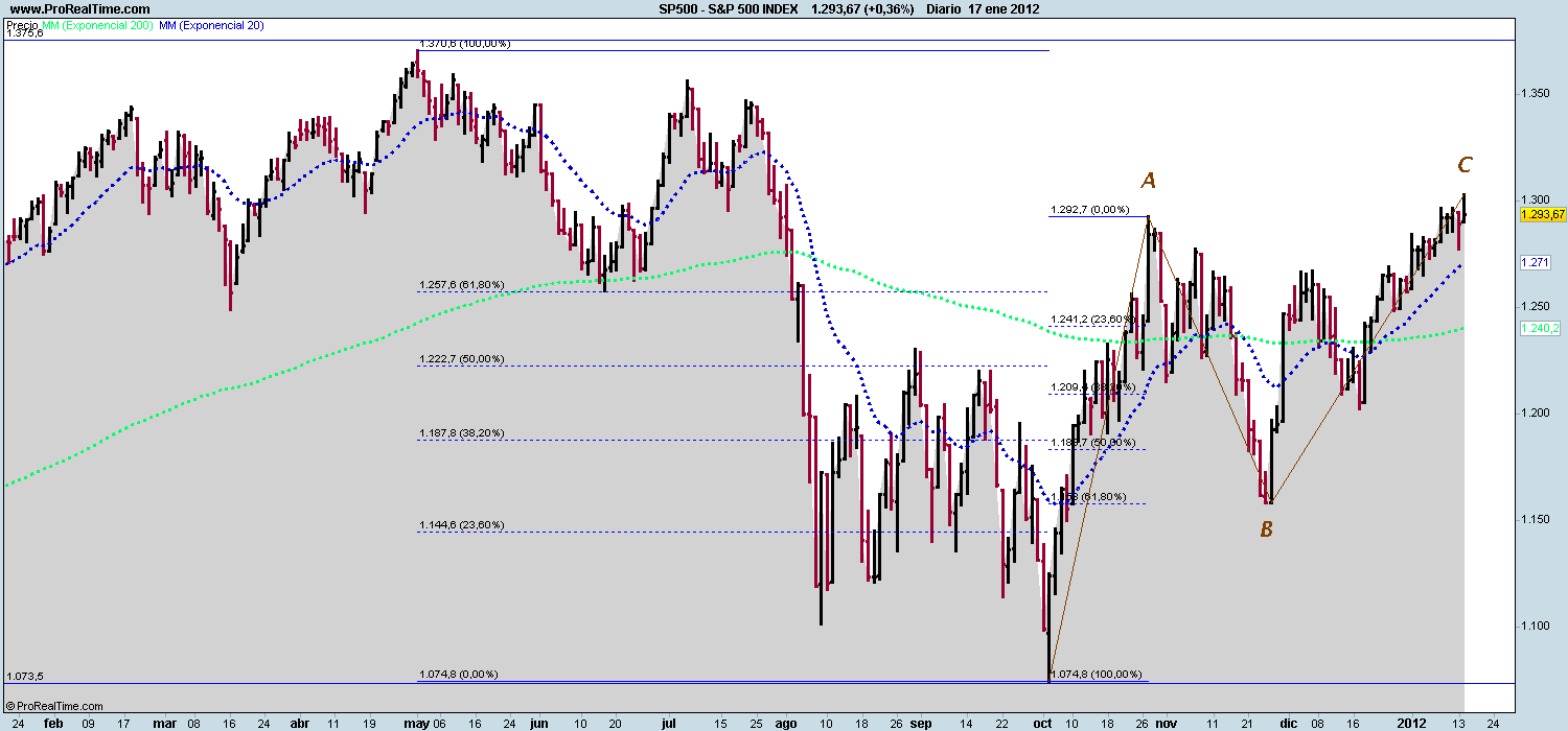 El índice ha corregido perfectamente en tres ondas A, B y C, toda la caída del 2011, con lo que una vez finalizada la subida, debería caer a mínimos de octubre en primera instancia. Ese es el escenario más probable si no surge ninguna noticia positiva que sirva de catalizador a los mercados de renta variable. Esa noticia positiva podría ser un acuerdo definitivo en la Unión Europea o bien la aprobación de un QE3 por parte de la Reserva Federal Americana. Crucemos los dedos.