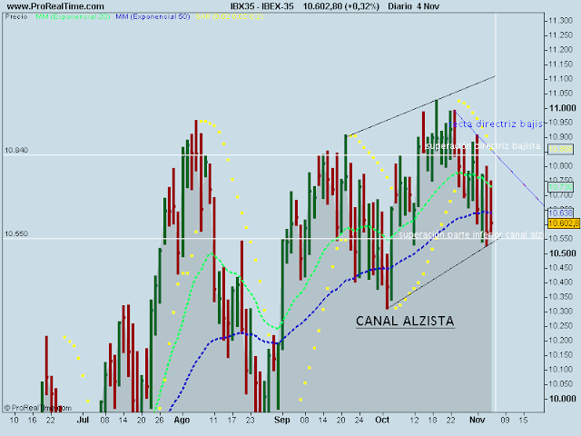 Día de resaca post-comunicado de la Reserva Federal de Estados Unidos en el que se anunció la nueva inyección de liquidez en el sistema financiero. El plan Bernanke intenta provocar un aumento del nivel de precios en la renta variable bajo la creencia de que si ésta aumenta de precio provocará confianza en la economía y de rebote el incremento del consumo (la base del sistema). Todo esto se ha traducido en un rebote considerable y generalizado en todas las bolsas del mundo exceptuando el Ibex 35 que ha cerrado con una subida bastante modesta del 0,32% en los 10.602,80 puntos, SANTANDER y BBVA han impedido, una vez mas, que el índice subiera con más claridad. El Ibex 35 sigue enclaustrado dentro del canal alzista iniciado en septiembre y por debajo de la recta directriz bajista iniciada el 25 de octubre, tal y como se puede apreciar en el gráfico adjunto :
