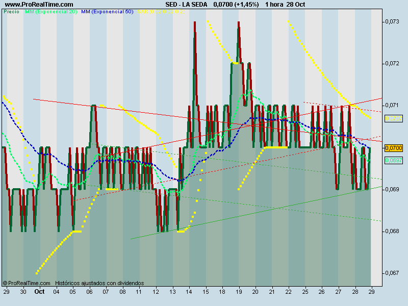 La operación en cuestión era comprar 100.000 acciones de LA SEDA DE BARCELONA a 0,07 euros/acción. Antes de decirle mi opinión me pareció importante explicarle las implicaciones que tiene invertir en valores como LA SEDA, es decir, valores con un valor de mercado inferior a 1 euro. Estas implicaciones son que suelen ser empresas con una liquidez muy baja y podemos llevarnos más de un susto invirtiendo en ellas. ¿Qué quiere decir que suelen tener una liquidez muy baja? Pues quiere decir que podríamos tener problemas a la hora de vender en caso de momentos de pánico. Si se decide especular a muy corto plazo con estos valores, habría que hacerlo con CFDS, nunca con acciones. Aún así, si se decide hacerlo con acciones, la operación se tiene que plantear a medio y a largo plazo, ya que la variación del precio en este espacio de tiempo es mínima, como se puede comprobar en el gráfico que adjunto arriba. Las empresas que cotizan en el mercado continuo español que tienen un precio de mercado por debajo de 1 euro/acción son las siguientes:
