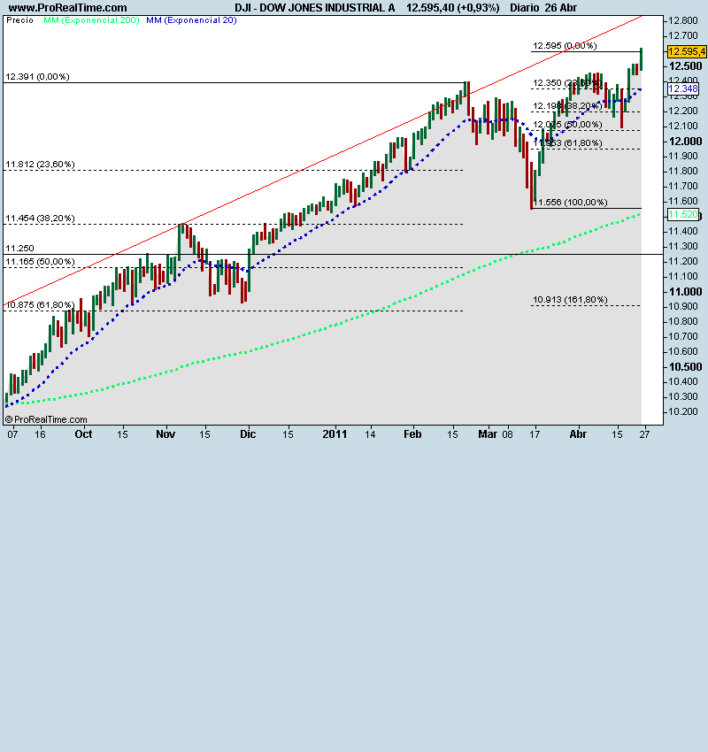 Todo esto nos hace pensar en un retorno de las caídas. Hoy la FED comunicará si mantiene los tipos de interés en el nivel actual ( que será lo más probable ) y más tarde a las 20:30 hora española, Ben Bernanke comparecerá en rueda de prensa. Aunque en un principio el motivo de la comparecencia es la decisión de tipos, el mercado espera que de alguna pista sobre si se continuará con el Plan de Relajación Cuantitativa ( QE2 ) después de su finalización el 30 de junio.