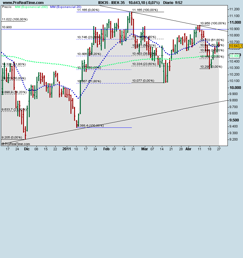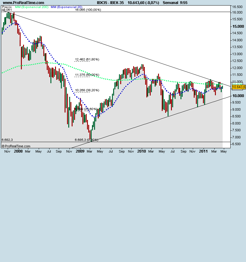 En cuanto al Ibex 35, su comportamiento ha sido similar a lo acontecido en Wall Street, es decir, asistimos a una corrección que empezó el día 8 y terminó el día 18 con un mínimo en el nivel de los 10.290 puntos. Desde esa cota ha rebotado hasta los 10.699 puntos y ahí se ha parado respetando por arriba y abajo las rectas directrices del triángulo en gráfico semanal como se aprecia en el siguiente gráfico :