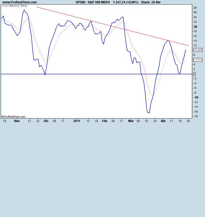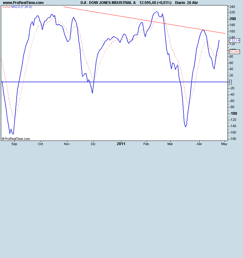 Actualmente los indicadores de momento no se encuentran en los niveles vistos a principio de mes, pero en gráfico mensual todavía se encuentran en cotas que no invitan a confiar en una continuación de las subidas. El índice VIX de volatilidad ha roto el soporte de los 16 puntos, moviéndose dentro del intervalo de los 15-16 puntos, esto tiene un componente positivo que es el alza del precio pero tiene también un componente negativo y es el sentimiento de confianza existente en el mercado, lo que puede anticipar por la Teoría de la Opinión Contaria una caída significativa. Niveles tan bajos pueden anticipar un rebote de dicha volatilidad que se traduciría en un brusco retroceso . Además en gráfico diario se han formado divergencias bajistas entre el precio y el Macd, exactamente igual que a principios de mes, lo cual se tradujo en una corrección que llevó al S&P 500 y al DOW JONES INDUSTRIAL a marcar mínimos en las cotas de 1.294 y 12.093 puntos respectivamente.