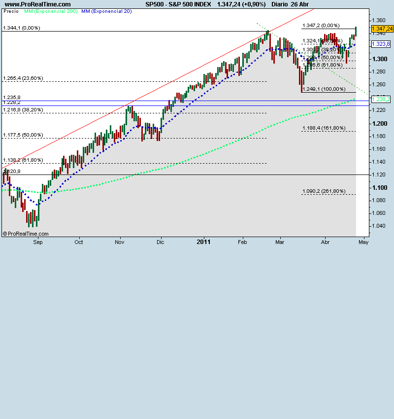 En nuestro último análisis http://www.rankia.com/blog/perdonporespecular/728524-analisis-situacion-s-p500-dow-jones-industrial-ibex-35-7-abril-2011 comentábamos que el S&P 500 y el DOW JONES INDUSTRIAL se encontraban desde el mes de febrero en niveles elevados de sobrecompra en gráfico mensual. Dichos niveles se mantuvieron a finales de marzo y planteábamos como escenario más probable un fuerte retroceso en abril que aliviara dicho nivel de sobrecompra. El día 8 se produjo dicha descarga en ambos índices. La corrección se extendió hasta el día 18, en el que desplegó un fuerte movimiento al alza. Durante esos días los indicadores de momento descargaron considerablemente la sobrecompra acumulada en los meses precedentes y realmente parecía que por fin corregiríamos hasta final de mes y afrontaríamos mayo en niveles en los que sí que se pudiera iniciar una subida con garantías.