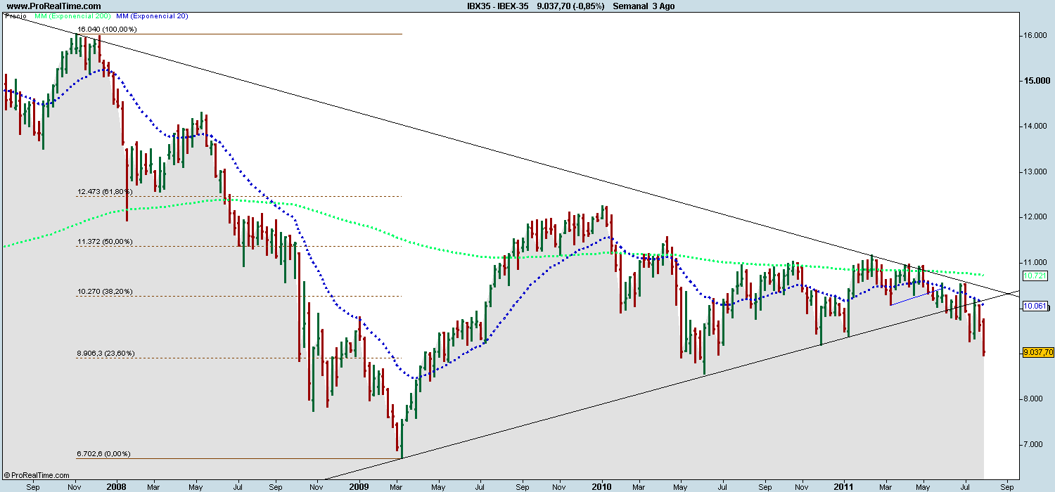Nos parece adecuado, en estos momentos de pánico, analizar con un poco de perspectiva, la situación gráfica del IBEX 35 desde el techo de mercado de noviembre de 2007 en los 16.000 puntos.