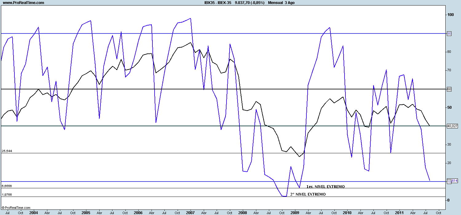 Dicha sobreventa en gráfico mensual se puede apreciar perfectamente en el RSI :