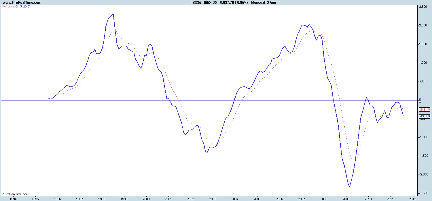 La semana pasada esperábamos retrocesos hacia los 9.850 puntos y apuntábamos que mientras se mantuviera por encima de ese nivel, consideraríamos los retrocesos como normales después de las fuertes subidas precedentes y apuntábamos que la probabilidad de alcanzar la cota de los 10.500 puntos era muy elevada. También advertíamos que el riesgo de caídas hacia la zona de los 9.000 puntos estaba latente mientras el MACD mensual estuviera cortado a la baja. Pues siguiendo los preceptos de la ley de Murphy," si algo malo tiene que pasar pasará " efectivamente, ha pasado. Prima de riesgo por encima de los 400 puntos básicos, muchos problemas para aprobar el techo de deuda americano, ISM manufacturero en los 50 puntos ( casi a niveles de recesión que se encuentran en los 49 puntos ), dudas respecto al segundo rescate griego ( como comentábamos en el último post ), el rating de EEUU en perspectiva negativa, el ISM servicios peor de lo esperado........ ¿ Dónde están en estos momentos tan críticos el BCE y la FED ? No sabe, no contesta.....