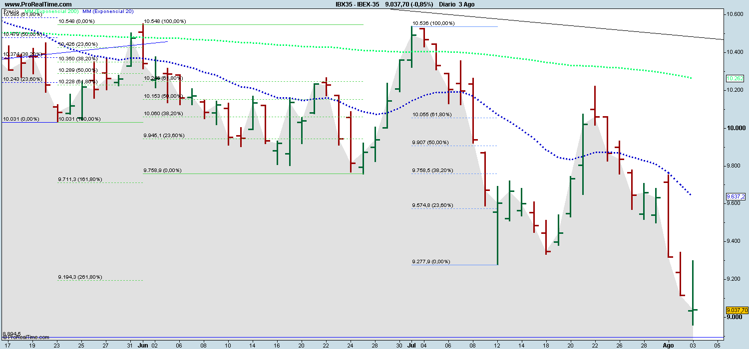 Hay que decir que situaciones extremas como la actual llevan consigo rebotes bruscos debido a la sobreventa acumulada en gráfico diario, pero mientras no se supere el nivel de los 9.575 puntos en primera instancia y los 9.850 puntos en segunda instancia, van a ser simples rebotes. El escenario más probable es el expuesto anteriormente.