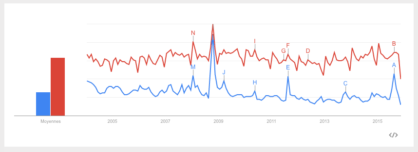 Continuando con el tema, recordé que Google nos da acceso al Big Data mediante su 'Google Trends' (porque le interesa lo que te interesa, claro está...) y por supuesto, lo primero que se me ocurrió buscar fue 'Bolsa' y 'Stock Market', econtrando los siguientes resultados desde el 2004 hasta hoy.