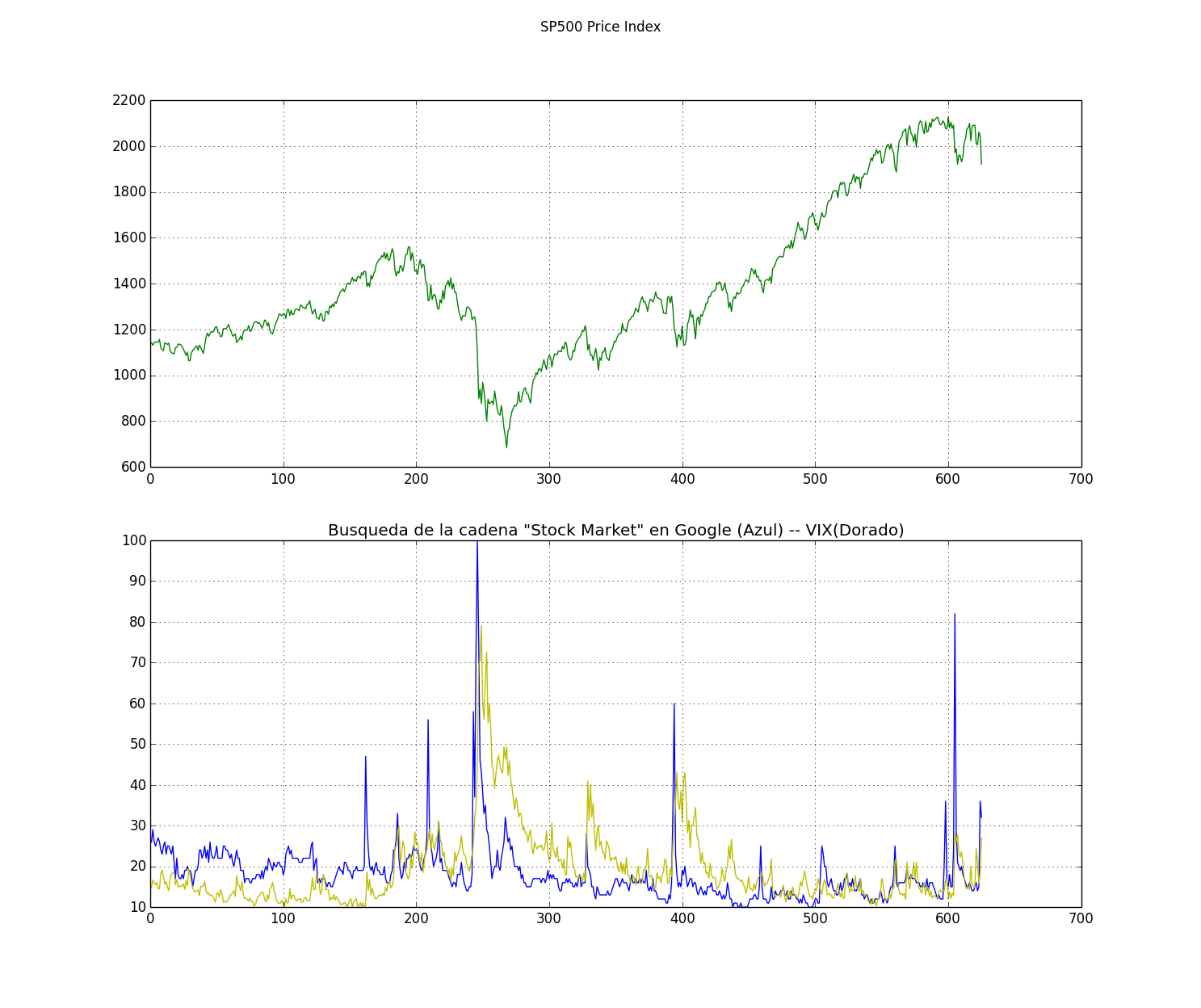 El caso es que retomando el indicador que me saqué de la manga hace unas semanas, en el que se computa el número de búsquedas de la cadena 'Stock Market' en Google como indicador de pánico, una vez más correla perfectamente con el VIX: No hay miedo. Si os fijais, la curva azul del gráfico de abajo, el último valor (correspondiente al viernes pasado) no llega ni por asomo al valor de 80 que alcanzó tras las caídas de finales de agosto. Esto, podría ser interpretado como un signo alcista, ya que según esta hipótesis la capitulación se produjo en esa fecha y ahora se está formando un suelo.