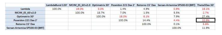 Si son los resultados mensuales los que queremos controlar, de forma que mensualmente no tengamos activos correlacionados entre sí, deberíamos de calcular las correlaciones mensuales de los activos. Estas correlaciones nada tienen que ver con las calculadas con datos diarios, tal y como se muestra en la siguiente tabla.