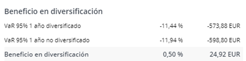 Esta cartera de inversión tiene un VaR de -11,44%, que como hemos explicado anteriormente significa que si no hacen muchas acciones de compra-venta se tiene una probabilidad de 95% de perder un máximo de 11,44%. En el análisis de riesgo que podemos obtener en “Mi Cartera” podemos comparar el VaR con el Smart Benchmark ( referencia para nuestra cartera). Además gracias a la herramienta Mi Cartera se pueden obtener cifras absolutas relacionadas a la volatilidad.