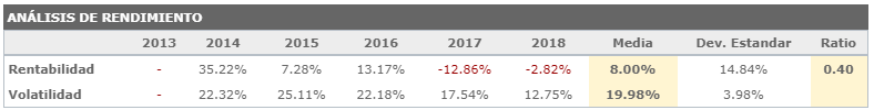 El comportamiento pasado no tiene por que marcar el futuro, rentabilidades pasadas no gantantizan rentabilidades futuras, pero si nos ayudan a entender su comportamiento, en el T-Report tenemos un detalle del comportamiento de la rentabilidad y volatilidad en los últimos 6 años, su respectiva media y la desviación estándar entre la rentabilidad y la volatilidad. El ratio nos indica la relación entre la rentabilidad obtenida y el riesgo, entre más grande sea el Ratio nos indica que la rentabilidad es mejor en relación al riesgo.