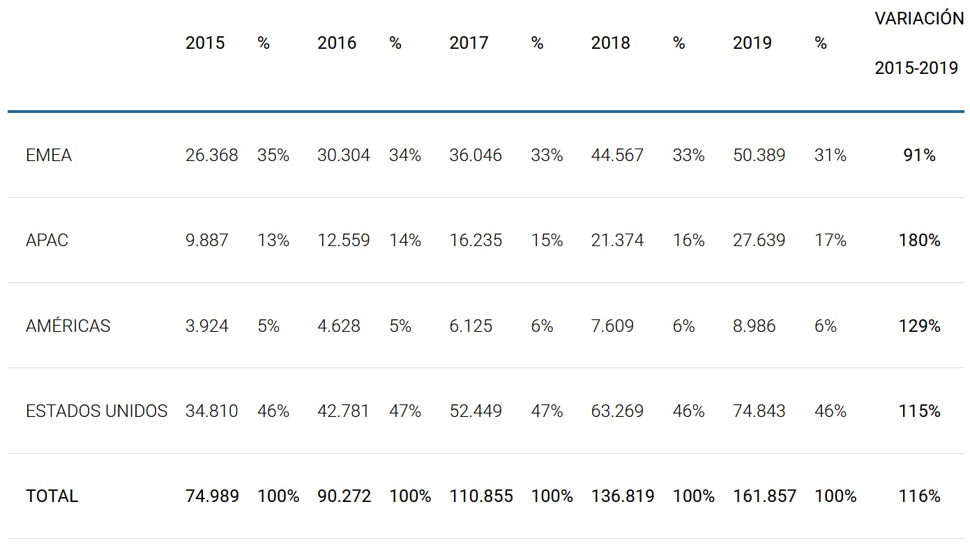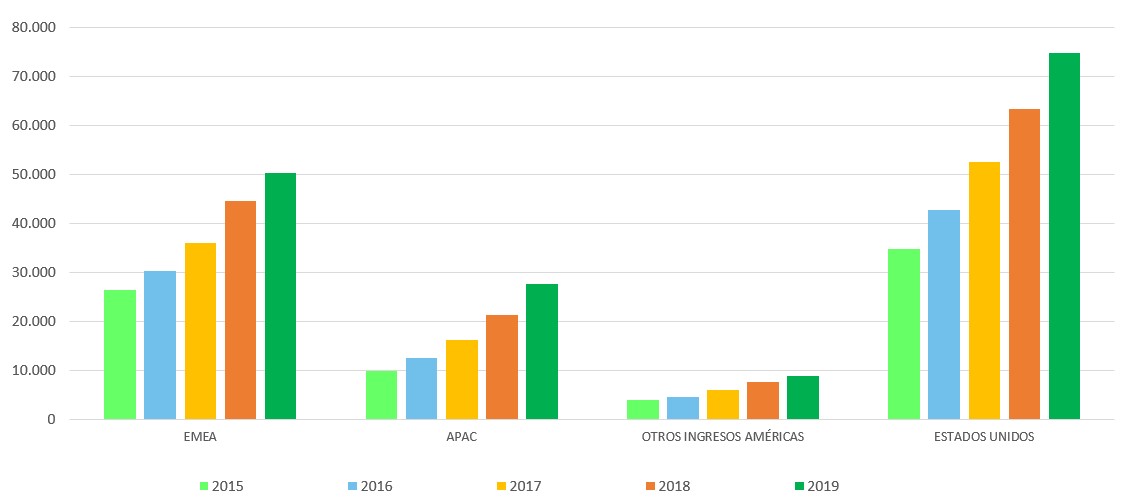 La evolución reciente de sus ingresos por zonas geográficas ha sido la siguiente: