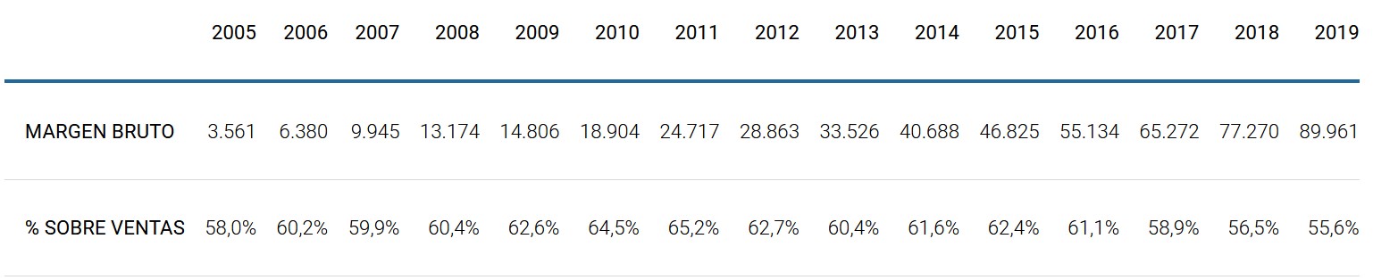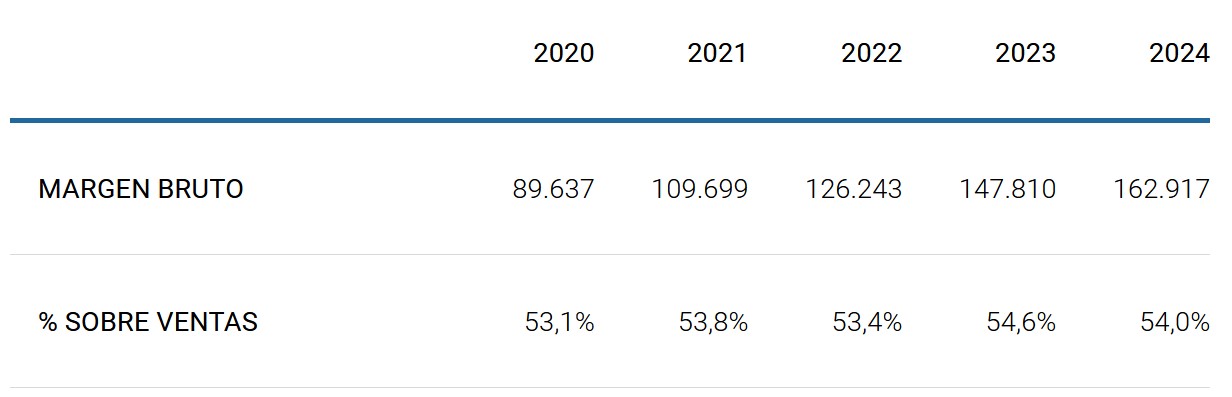 El porcentaje de margen bruto sobre ventas presenta una tendencia descendente en los últimos años: