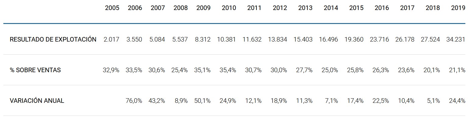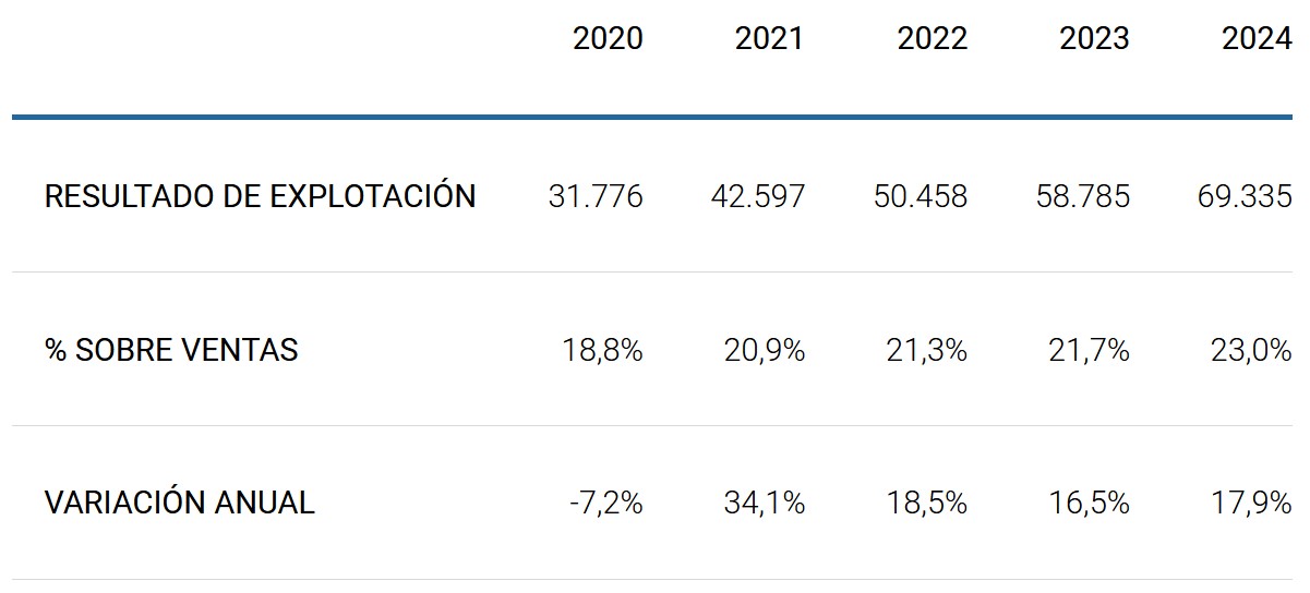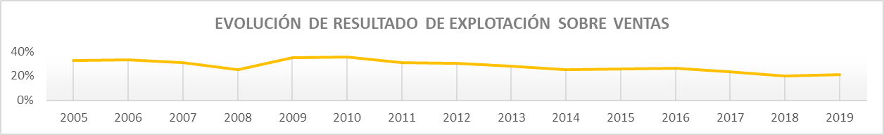El resultado de explotación aumenta en todo el periodo estudiado, pero en porcentaje sobre ventas presenta una tendencia descendente: