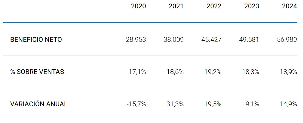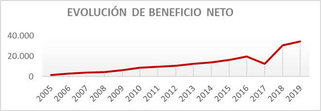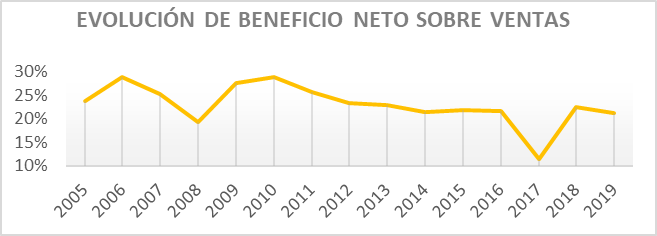 Las cifras de beneficio neto presentan una tendencia creciente, sin embargo, el porcentaje sobre ventas ha ido disminuyendo: