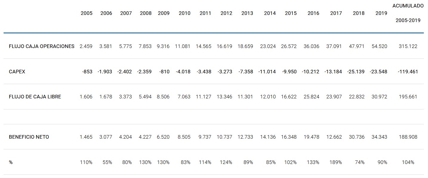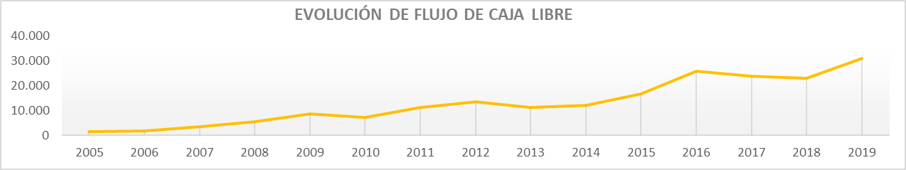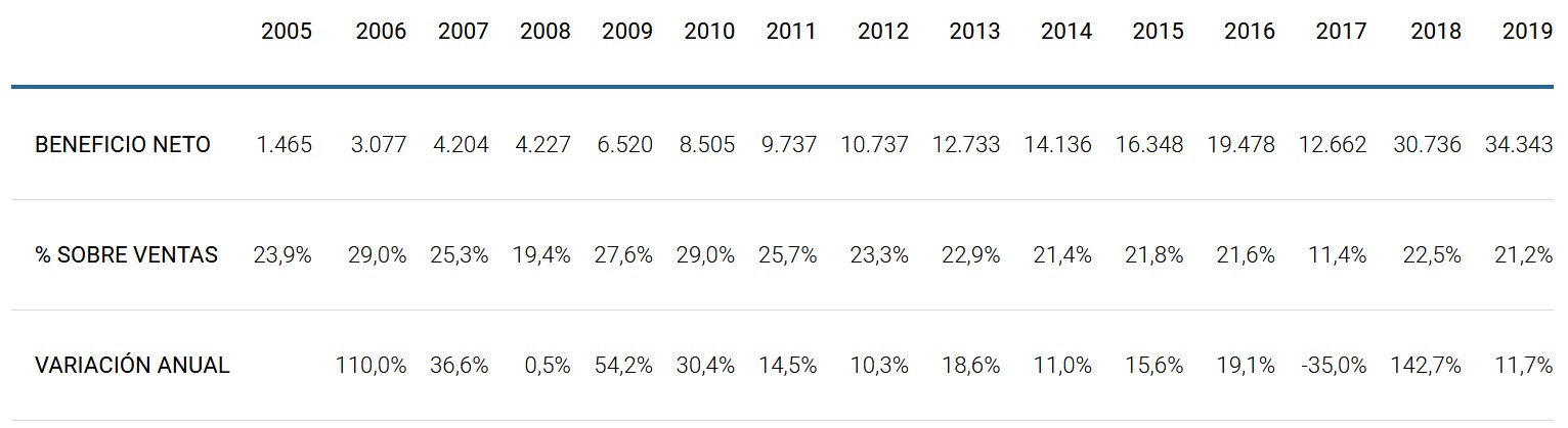 Los porcentajes de rentabilidad sobre los fondos propios que consiguen son bastante buenos (17%), a pesar de estar castigados por la acumulación de tesorería excedentaria en la empresa. Si hubieran reducido sus reservas distribuyendo 100.000 millones de dólares de tesorería excedentaria la rentabilidad del año 2.019 hubiera sido del 33,8%.
