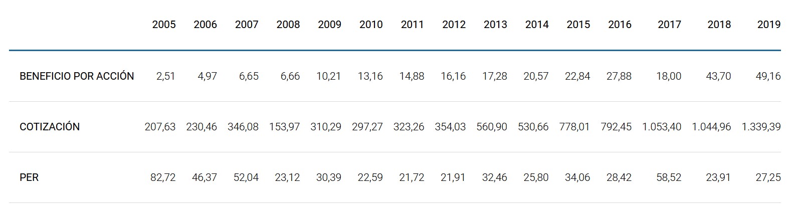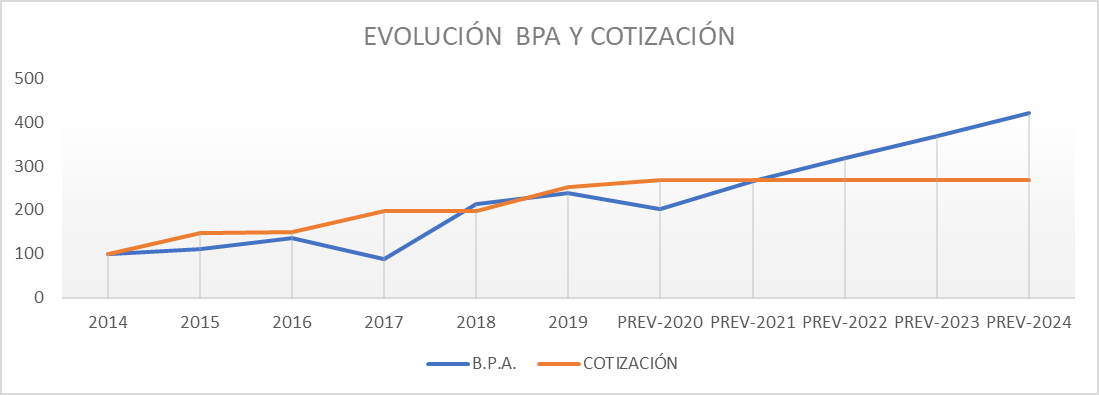 Donde podemos ver como el aumento continuado del beneficio por acción ha impulsado el fuerte incremento de la cotización.