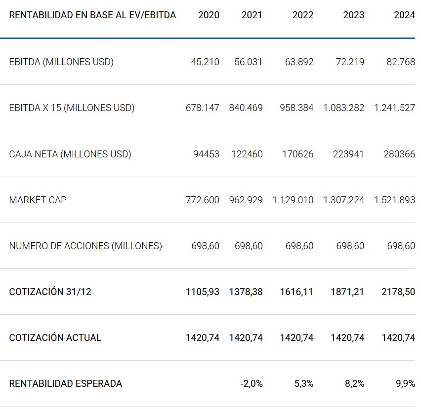En la siguiente tabla detallamos los cálculos de las rentabilidades esperadas en base a las previsiones de los analistas, calculadas con los múltiplos que se indican: