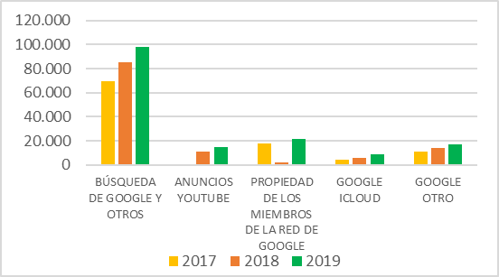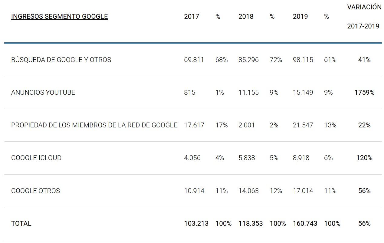 - Google: incluye todos sus productos principales, los cuales aportaron en el año 2.019 el 99,3% de los ingresos de la compañía.