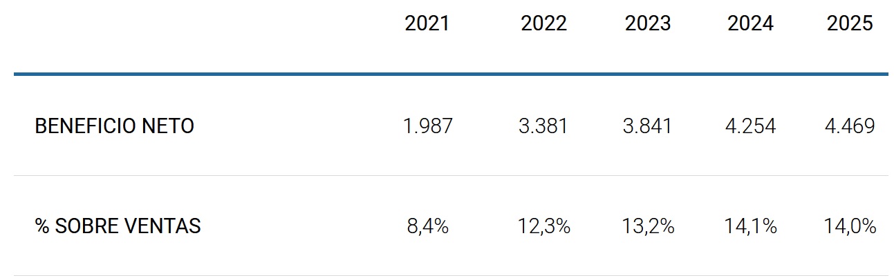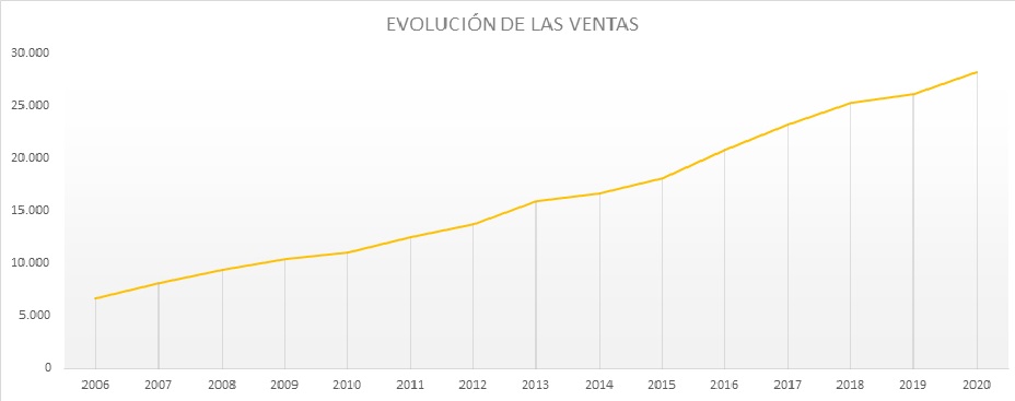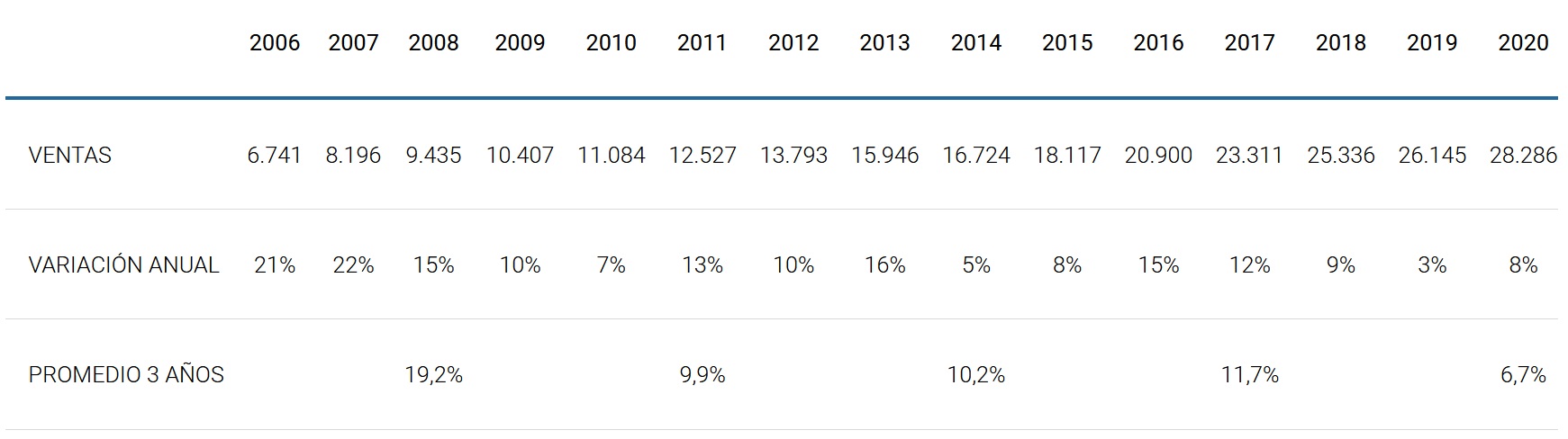 Las ventas de la empresa han crecido con buen ritmo durante todo el periodo estudiado, si bien se observa una tendencia a ralentizarse en su porcentaje de aumento: