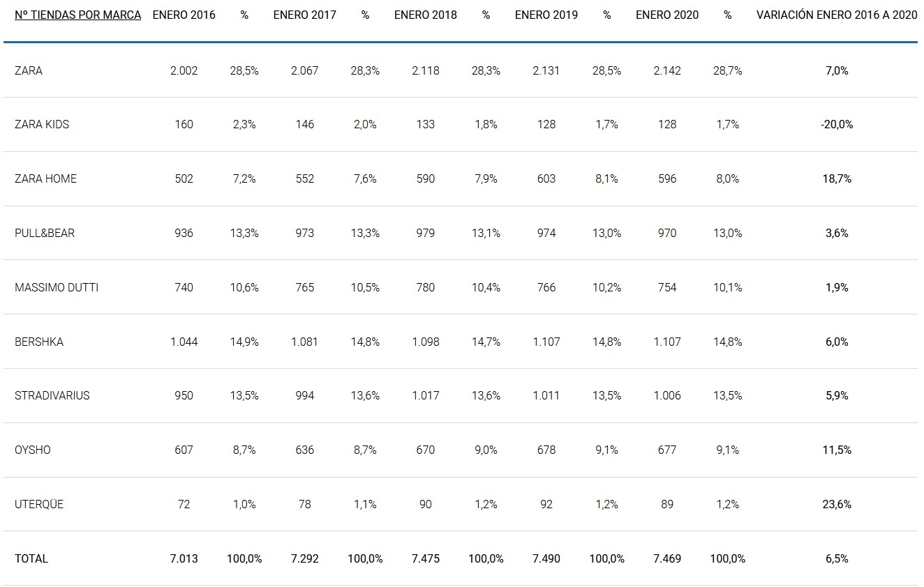 A destacar que, en el último año, por primera vez en la historia de Inditex, el número total de tiendas ha disminuido y que la marca comercial Zara es la única que ha aumentado el número de tiendas.